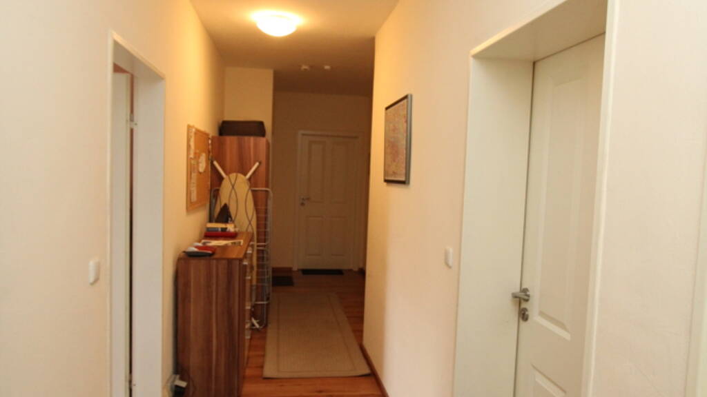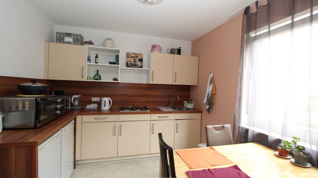 Bei dieser besonderen Immobilie handelt es sich um eine Wohneinheit, die bereits bei ihrer Entstehung als Alternative zum Hotelbetrieb und speziell für die kurzzeitige Vermietung konzipiert wurde. Die Wohnung verfügt über fünf separate Zimmer mit jeweils ca. 11-13 m², die jeweils mit einem eigenen Bad (Dusche, WC, Waschbecken) ausgestattet sind. Zwei der Zimmer bieten zusätzlich kleine Balkone. Ein ehemaliges sechstes Zimmer wurde zu einer gemeinschaftlich nutzbaren Küche umgestaltet, wobei der Anschluss des ursprünglichen Badezimmers nun als Waschmaschinenanschluss dient.