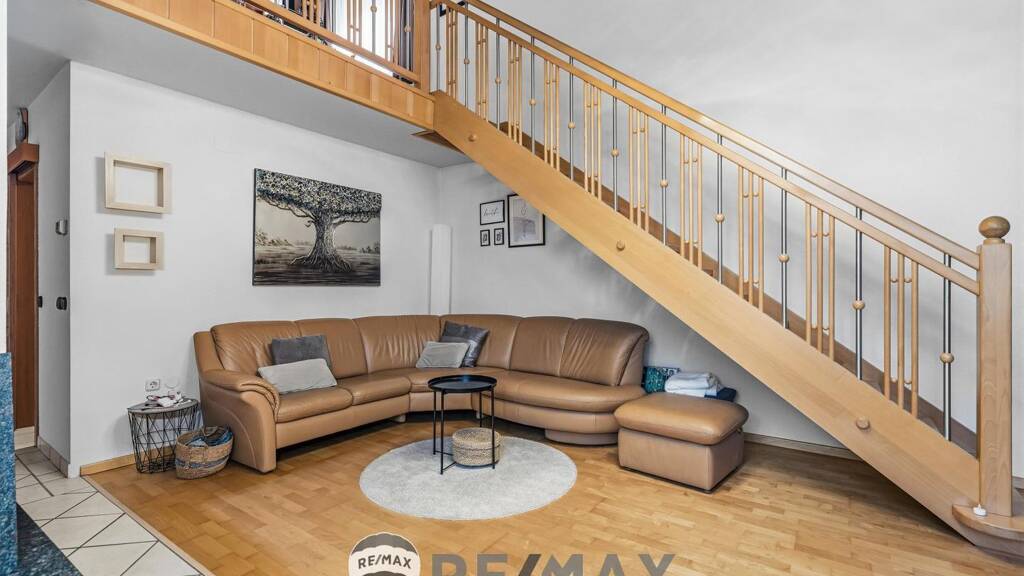 Im Erdgeschoss erwartet Sie ein einladendes Vorzimmer, eine separate Küche sowie ein vielseitig nutzbares Kabinett bzw. Schlafzimmer. Ergänzt wird diese Ebene durch einen praktischen Abstellraum, ein Badezimmer, ein WC sowie ein weiteres Schlafzimmer. Das Herzstück des Hauses bildet das großzügige Wohnzimmer mit integriertem Essbereich. Von hier genießen Sie einen wunderbaren Blick in den Garten sowie hinauf zur offenen Galerie im Obergeschoss, was dem Raum eine besondere Weite und Eleganz verleiht.