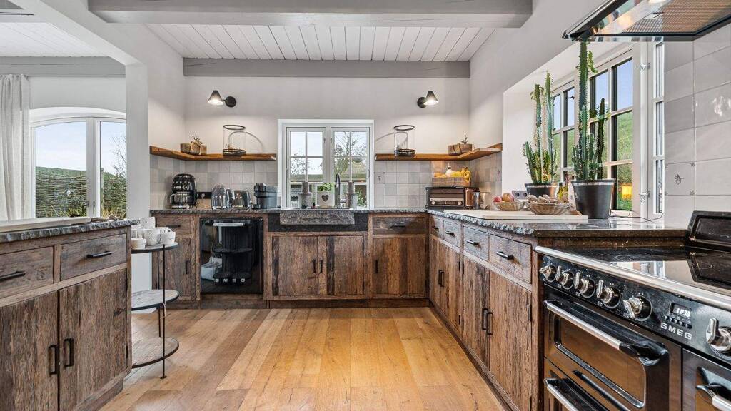 Das gesamte Objekt besticht durch eine außergewöhnlich hochwertige Materialauswahl. Naturstein und Blausteinfußböden, edle Eichenholzböden, massive Türzargen aus Eichenholz sowie liebevoll ausgewählte Delfter Fliesen in den Küchen und Badezimmerbereichen schaffen ein warmes, elegantes Ambiente mit nordischem Charakter. Eine klassische Klön-Schnack-Tür unterstreicht zusätzlich den traditionellen Stil des Hauses.