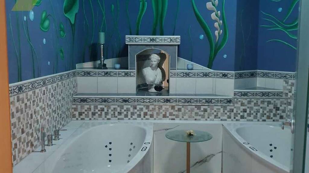 Wellnessbereich mit klassischer Finnischer Sauna, Bio-Sauna, Osmanischem Dampfbad, Ruheraum, Fußbad, Sitzbad mit zwei Whirlpool-Badewannen, Dusche, Umkleiden und Toilette