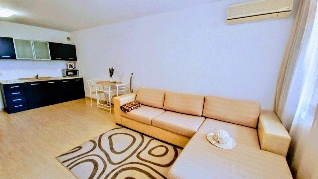Zum Verkauf steht ein vollständig möbliertes Studio-Apartment im eleganten und gepflegten Komplex Etera 3, gelegen im ruhigen, grünen Teil von Sweti Wlas, nur ca. 300 Meter vom Sandstrand und der beliebten Marina Dinevi entfernt.