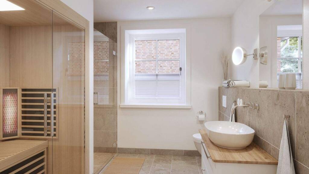 -Wellnessbad mit Travertin-Fliesen, groĂźer Dusche, Infrarotkabine & FuĂźbodenheizung