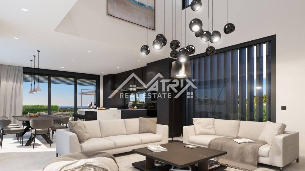 Each of these villas extends over the ground floor and first floor, with a total living area of ??almost 600 m2. The ground floor of each house is designed as an open space that unites the living room with the dining room and kitchen, with one bedroom with its own bathroom and walk-in closet, and the ground floor is complete with a guest toilet, laundry room and utility room. The living room leads to the pool terrace through large glass walls that provide plenty of light throughout the day, as well as a beautiful view of the sea. The internal stairs lead to the first floor, where there are three bedrooms, each of which has its own bathroom and walk-in closet, and each room offers a view of the sea.