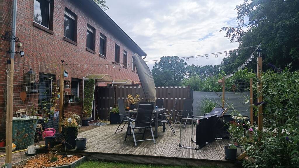 Linke Hälfte 6 Zimmer, 2 Bäder, Abstellraum. Großes Fenster mit viel Licht, eigene Terrasse, weitläufiger Garten und praktische Blechhütte. Highlight: angrenzende große Weide für Tierhaltung, Garten oder Freizeit. Carport inklusive.