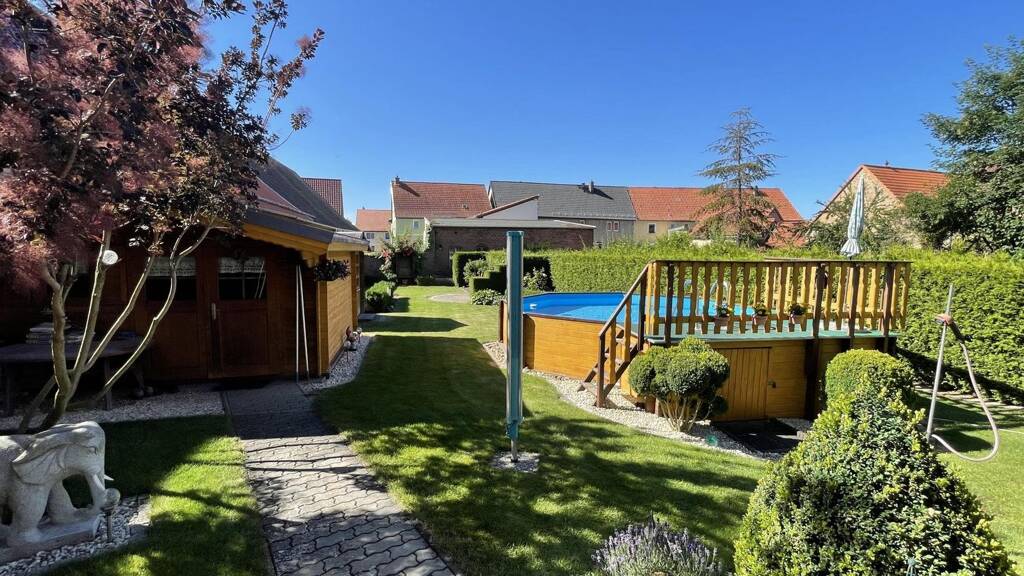In ruhiger Lage von Großneuhausen befindet sich dieses freistehende Einfamilienhaus, das 1998 in massiver Bauweise als Kern-Niedrigenergiehaus errichtet wurde. Auf einem großzügigen Grundstück von ca. 877 m² bietet die Immobilie nicht nur ein behagliches Zuhause, sondern auch ein liebevoll gestaltetes Gartenparadies. Der Garten ist sehr gepflegt und überzeugt mit geschmackvoller Bepflanzung, dekorativen Ziergehölzen und dichten Hecken, die für Privatsphäre sorgen. Ein besonderes Highlight ist der erhöhte, mit Holz verkleidete Pool, der in den Sommermonaten für Abkühlung und Urlaubsgefühl sorgt.