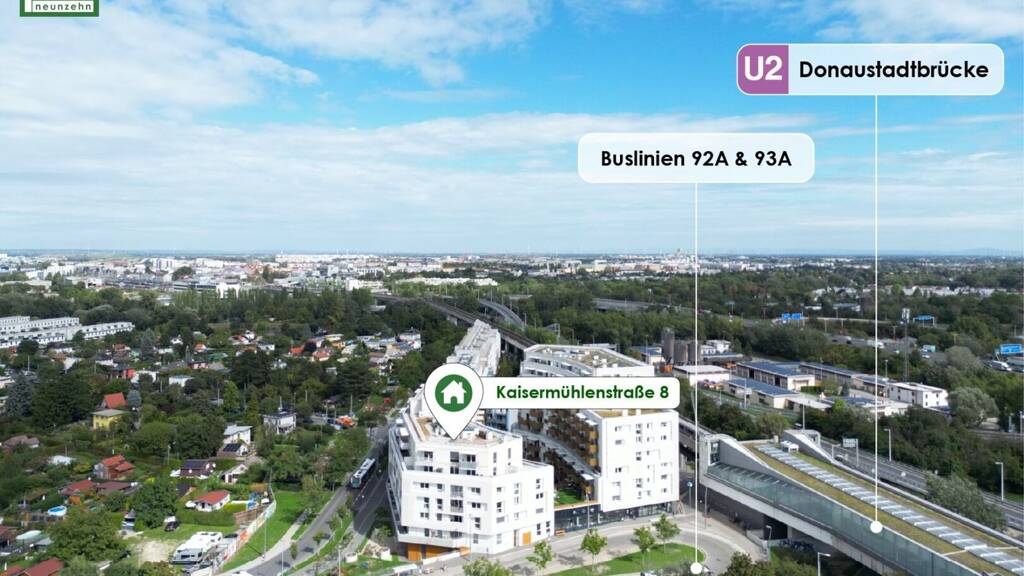 Aufgrund der guten öffentlichen Verkehrsanbindung erreichen Sie mit der U-Bahn in nur ca. 25 Minuten das Wiener Stadtzentrum und in ca. 10 Minuten mit der Buslinie 93A das Westfield Donauzentrum, wo Sie vielseitige Einkaufsmöglichkeiten und Restaurants erwarten. Mit der Autobahnauffahrt A23 erreichen Sie ebenso in kurzer Zeit die Wiener Innenbezirke!