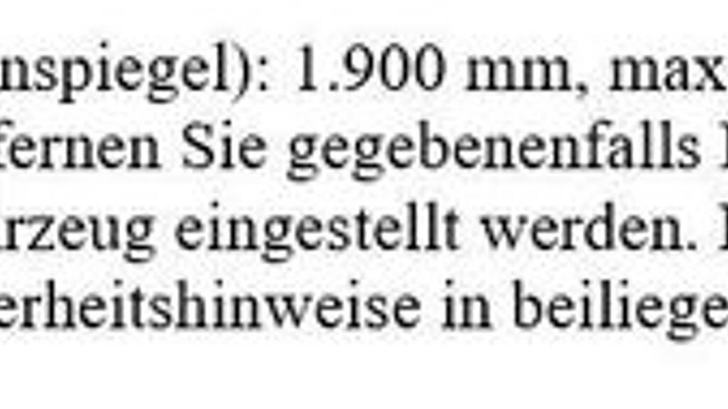 Benutzungshinweis für Hebebühnenabstellplatz: max. Länge: 5.000 mm, max. Breite (ohne Außenspiegel): 1.900 mm, max. Höhe 1.500 mm, max. Gewicht 2.000 kg, Parken Sie nur betriebssichere Fahrzeuge und serienmäßige Fahrzeuge ohne Sportausführung (tiefer gelegt, Spoiler, Niederquerschnittreifen) ein. Entfernen Sie gegebenenfalls Dachträger und feststehende Antennen. Die Hebebühnenplattform besitzt aus Sicherheitsgründen einen Vorderradanschlag. Dieser muss, bevor Sie die Plattform das erste Mal befahren auf Ihr Fahrzeug eingestellt werden. Fahren Sie langsam und nur vorwärts auf die Plattform. Das Ab- bzw. Einstellen von einspurigen Kraftfahrzeugen, auf Hebebühnenabstellplätzen, ist ausdrücklich verboten. Beachten Sie die Sicherheitshinweise in beiliegender Bedienungsanleitung, die einen integrierenden Bestandteil dieses Vertrages darstellt