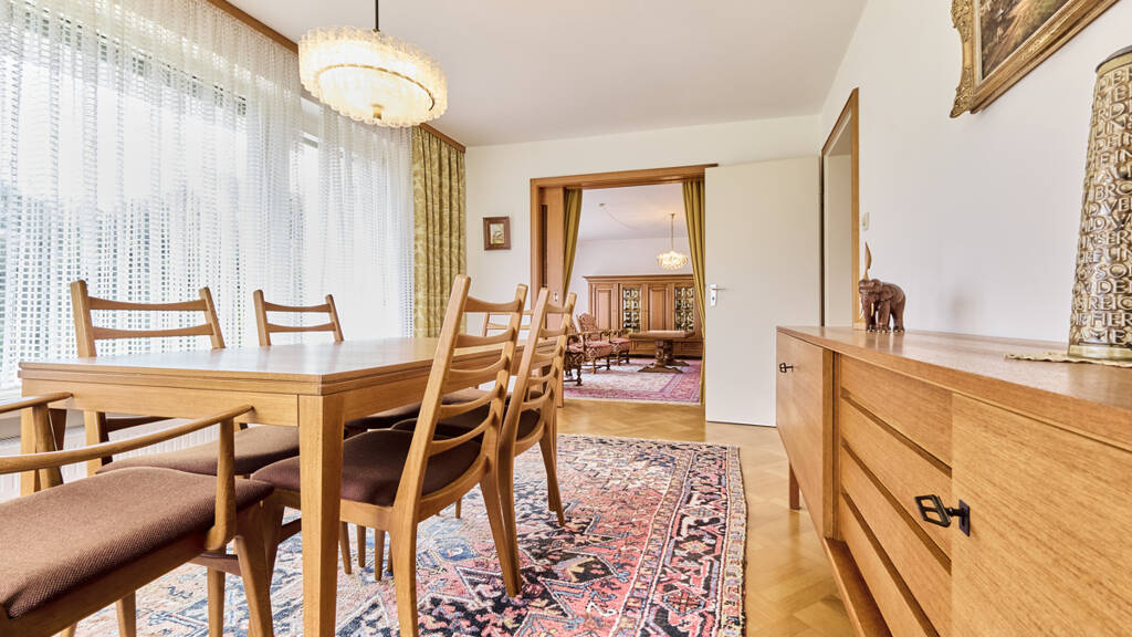 Der helle Wohn- und Essbereich im Erdgeschoss mit großen Fensterflächen schafft eine angenehme Wohnatmosphäre und eröffnet den direkten Blick in den weitläufigen Garten. Vervollständigt wird diese Ebene durch eine Küche samt Speisekammer sowie den langen Flur mit Garderobe und Gäste-WC.