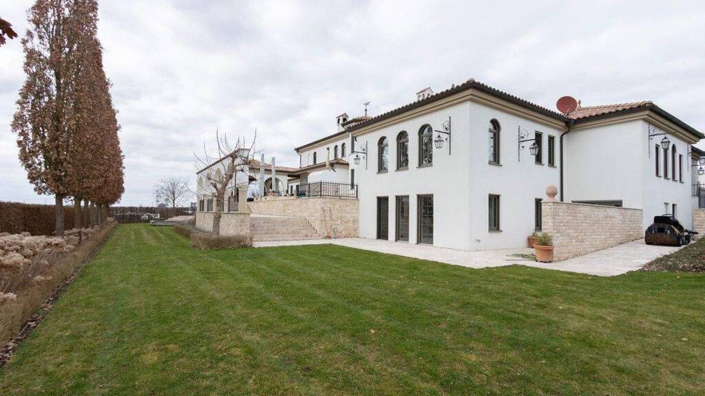 Über eine private Zufahrt erreichen Sie den Vorhof der Villa. Das Haupthaus überzeugt mit vier großzügigen Schlafzimmern, jeweils mit eigenem Bad en suite, einem lichtdurchfluteten Wohnzimmer, einem eleganten Essbereich sowie einer hochwertig ausgestatteten Küche. Ergänzt wird diese Ebene durch einen Abstellraum und ein Gäste-WC. Ein separater Zugang führt zu einer eigenständigen Wohneinheit, die sich ideal als Einliegerwohnung oder Büro nutzen lässt. Sie umfasst fünf Zimmer, ein Badezimmer sowie eine voll ausgestattete Küche. Im Untergeschoss befinden sich neben den Technikräumen weitere großzügige Abstellflächen. Hochwertige Materialien wie edle Marmorböden und warmes Parkett prägen das stilvolle und exklusive Gesamtbild des Hauses.