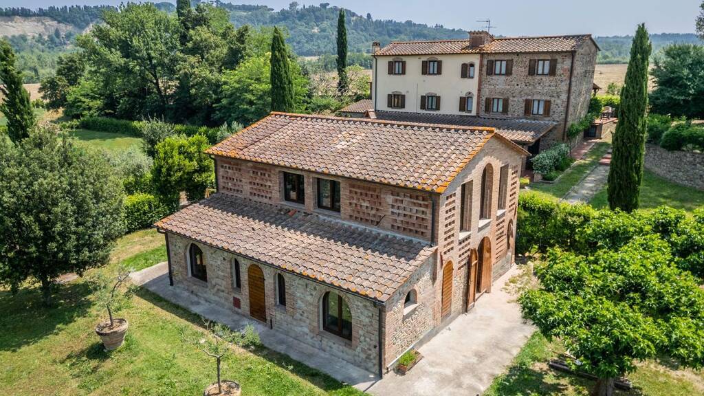 Das Hauptgebäude, ein historisches Bauernhaus aus den frühen 1800er Jahren, wurde im Jahr 2000 mit viel Sorgfalt und Liebe zum Detail vollständig renoviert. Heute präsentiert es sich in klassisch toskanischem Stil – mit charakteristischen Terrakottaböden, sichtbaren Holzbalken und einer rustikalen, warmen Atmosphäre, die Authentizität und Komfort gekonnt verbindet. Das Bauernhaus ist in sechs eigenständige Wohnungen sowie ein zusätzliches Büro unterteilt und bietet dadurch zahlreiche Nutzungsmöglichkeiten – sei es als privates Wohnhaus, als Ferienresidenz oder für touristische Vermietung. Ein weiteres Highlight des Anwesens ist die rund 180 m² große Scheune, die derzeit renoviert wird. Diese bietet vielseitige Gestaltungsmöglichkeiten – sei es als Eventraum, Atelier, Wellnessbereich oder zusätzliche Wohnfläche.