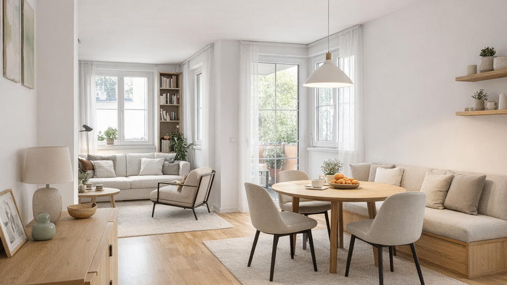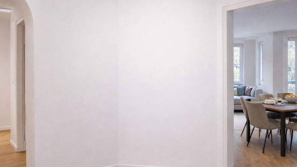 Hinweis zu den Abbildungen: Die Wohnung ist derzeit leer. Die abgebildeten Visualisierungen dienen ausschließlich der Veranschaulichung möglicher Raumwirkung, Einrichtungs- und Gestaltungskonzepte. Sie sind unverbindlich und stellen nicht den tatsächlichen Zustand oder Ausstattungsumfang dar.