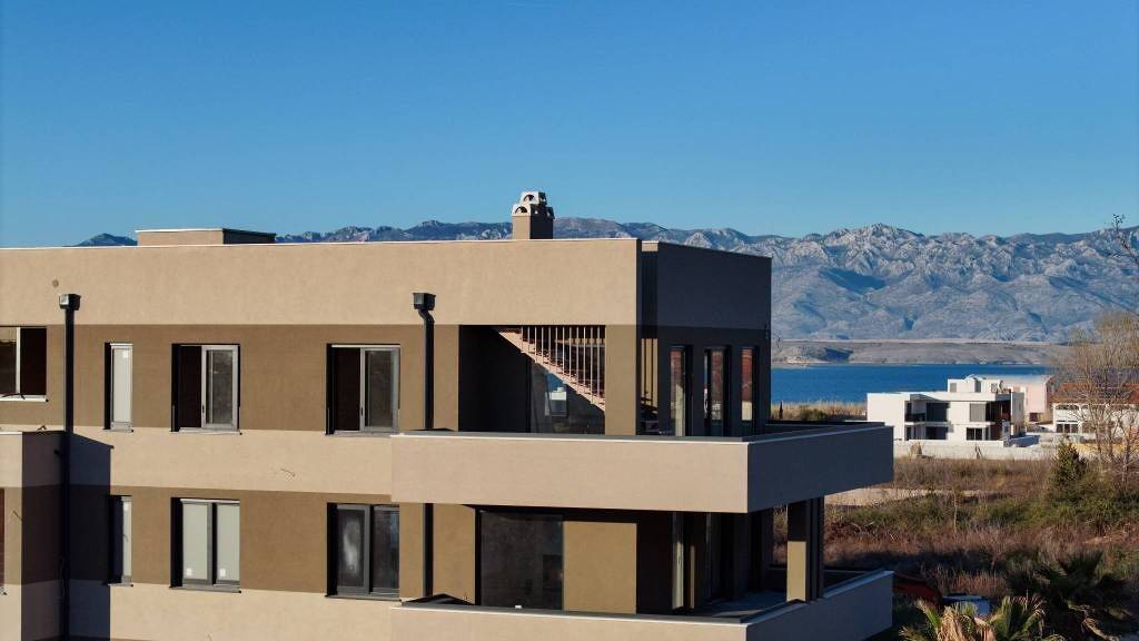 Die Wohnung mit einer Gesamtfläche von 220 m besteht aus einem Eingangsbereich, Küche, Esszimmer und Wohnzimmer, Badezimmer und drei Schlafzimmern, von denen eines ein eigenes Badezimmer hat. Vom Wohnzimmer aus gelangt man auf die offene Terrasse von 26,78 m, von der aus man einen wunderschönen Blick auf das Meer und den Velebit hat.