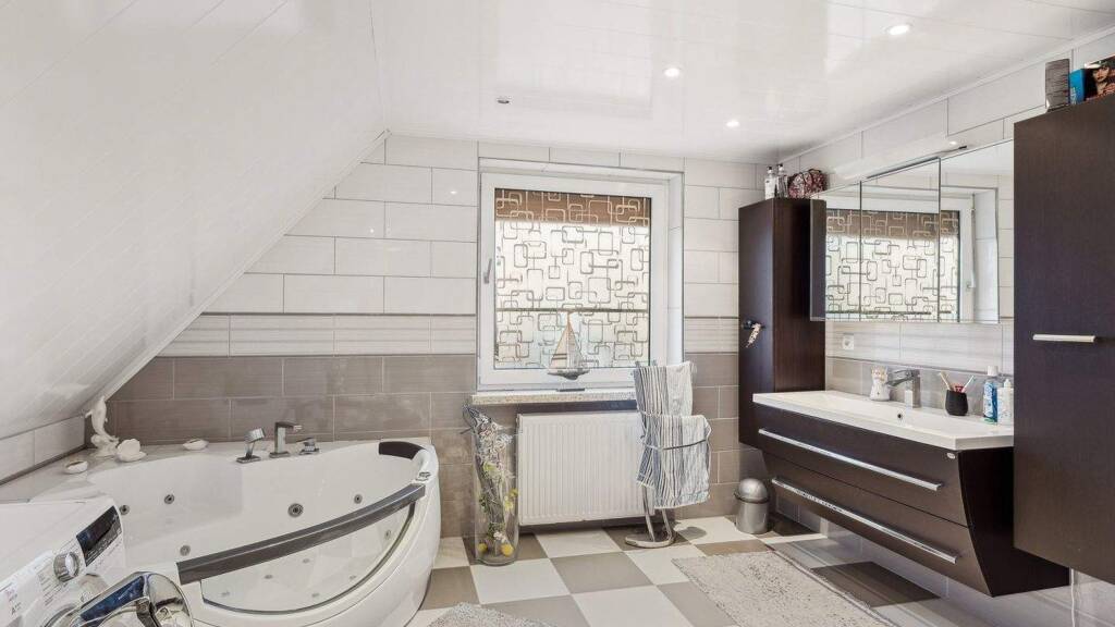 Das Haus verfügt insgesamt über sechs gut geschnittene Zimmer, die sich auf zwei Etagen verteilen. Im Obergeschoss befinden sich drei Räume sowie ein großzügiges, modernisiertes Badezimmer, ausgestattet mit Dusche und einer Badewanne inklusive Whirlpool-Funktion. Das Erdgeschoss bietet ebenfalls drei Wohn- bzw. Schlafräume und überzeugt durch eine flexible Raumaufteilung.