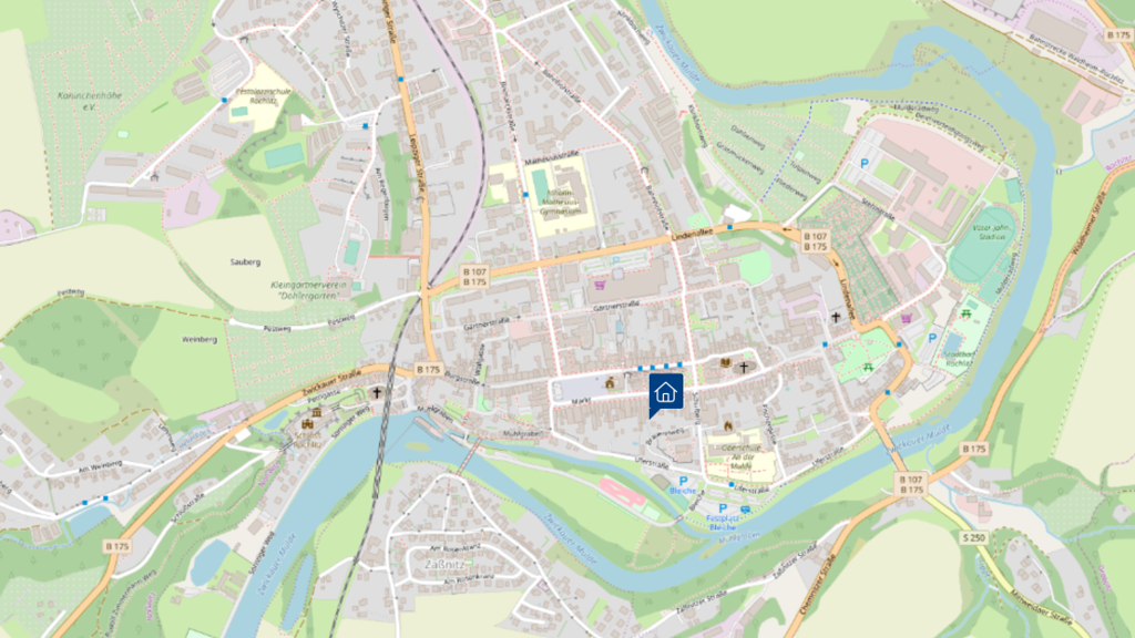 Die gepflegte Wohnung befindet sich in äußerst zentraler und dennoch sehr ruhiger Wohnlage von Rochlitz, nahe dem historischen Stadtkern mit Marktplatz, klassizistischem Rathaus und dem eindrucksvollen Schloss Rochlitz. Die Umgebung ist geprägt von der idyllischen Flusslandschaft der Zwickauer Mulde und dem Rochlitzer Berg mit seinem typischen roten Porphyr.