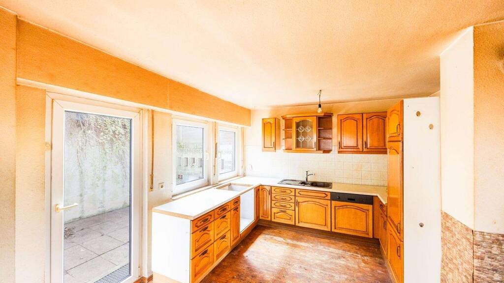 Ebenfalls linker Hand führt eine Türe in die Küche, die über ausreichend Platz für einen großzügigen Essbereich verfügt. Von hier aus haben Sie direkten Zugang zur Terrasse auf der rückwärtigen Seite des Hauses. Diese lädt zu gemeinsamen Abendessen während der Sommerzeit ein. Links von der Terrasse führt eine Treppe in den Garten hinter dem Haus.