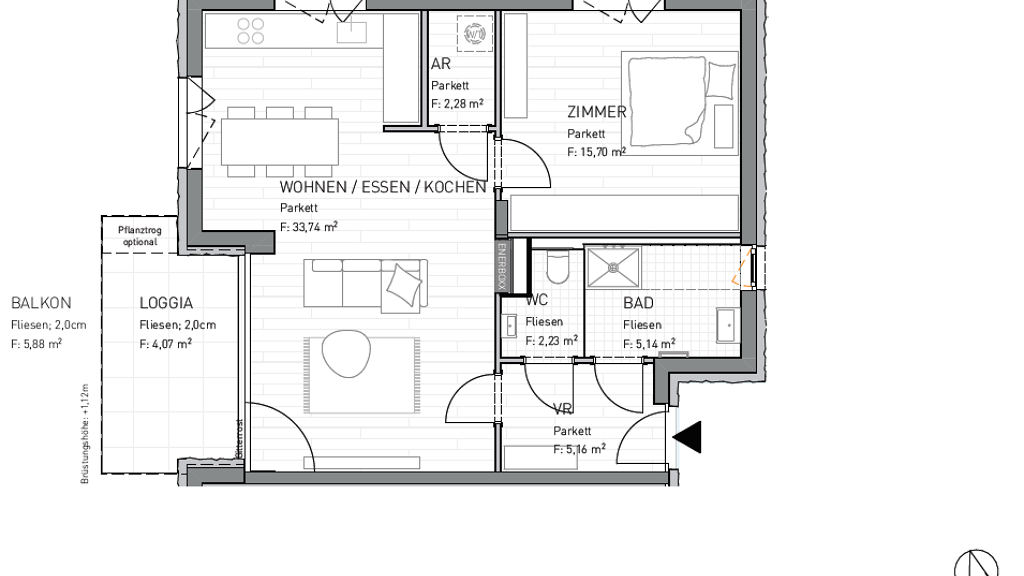 Bei dieser 64,25m2 großen 2 - Zimmer Wohnung wurde jeder Quadratmeter optimal genutzt. Beim Eintritt in den 5,16m2 Vorraum befindet sich der getrennte Sanitärbereich zu Ihrer Rechten. Durch den Vorraum gelangen Sie in den geräumigen Essbereich. Hier genießen Sie einen direkten Zugang zum knapp 10m2 großen Balkon, welcher zusätzlichen Freiraum bietet. Dies ist der perfekte Ort für gemütliche Sommerabende. Aus dem Wohnbereich gelangen Sie in das über 15m2 große Schlafzimmer, welches ausreichend Platz für einen Kleiderschrank zur Verfügung stellt. Sollte noch extra Stauplatz benötigt werden, finden Sie diesen im Abstellraum. Weiters kann ein Tiefgaragenplatz, je nach Größe zwischen 17.900 – 25.000€, oder ein freier Autoabstellplatz um 7.500€ erworben werden.