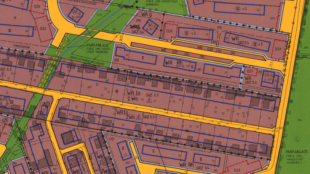 Nach dem gültigen Bebauungsplan Billstedt 90 I ist eine offene Bauweise mit einem Vollgeschoss zulässig. Darüber hinaus kann das Dachgeschoss ausgebaut werden, sofern es nicht als Vollgeschoss zählt und die geltende Geschossflächenzahl eingehalten wird. Die maximale Grundflächenzahl beträgt ca. 0,3. Das Baufenster liegt im nördlichen Teil des Grundstücks und umfasst ca. 12 m in der Breite sowie ca. 15 m in der Tiefe - verbunden mit einem großzügigen Südgarten. Damit bietet das Grundstück die Möglichkeit, entweder ein großzügiges Einfamilienhaus oder ein modernes Doppelhaus zu errichten.