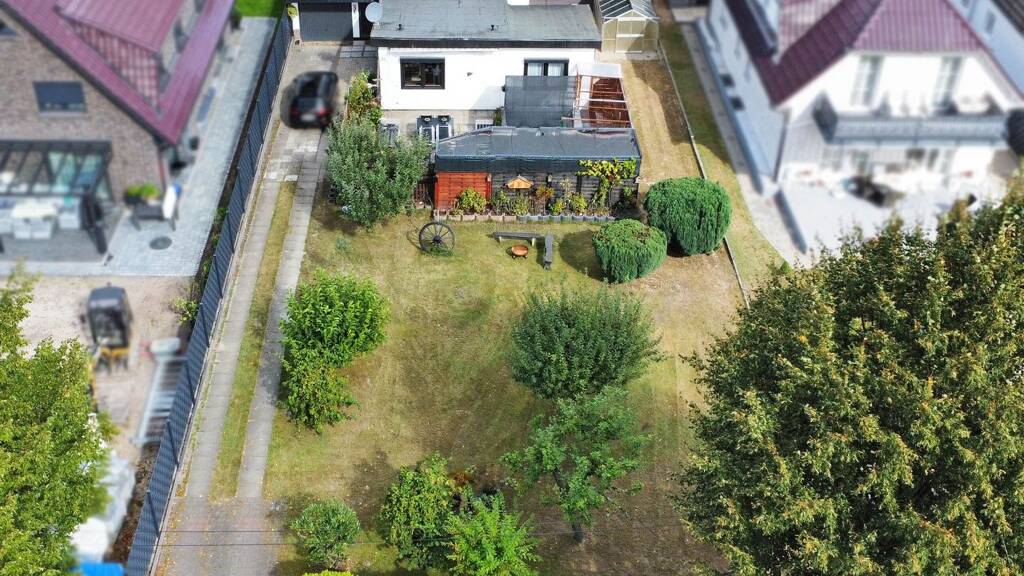 Auf dem Grundstück befindet sich derzeit noch ein Bungalow, der für eine Neubebauung entfernt werden muss. Dadurch eröffnet sich die Möglichkeit, die Fläche ganz nach den eigenen Vorstellungen zu gestalten und ein modernes Wohnkonzept zu verwirklichen. Das Grundstück besticht durch seinen alten Baumbestand, der ihm eine besondere Ausstrahlung und Natürlichkeit verleiht. Ergänzt wird dies durch einen großzügigen Gartenbereich mit Obstbäumen, der viel Platz für Erholung, Familienleben und individuelle Gartengestaltung bietet.