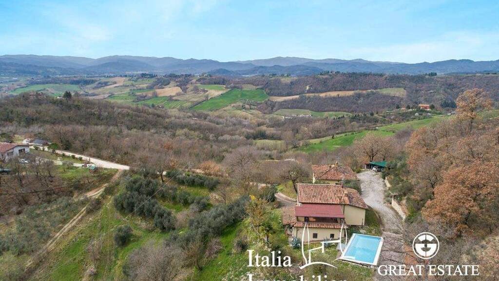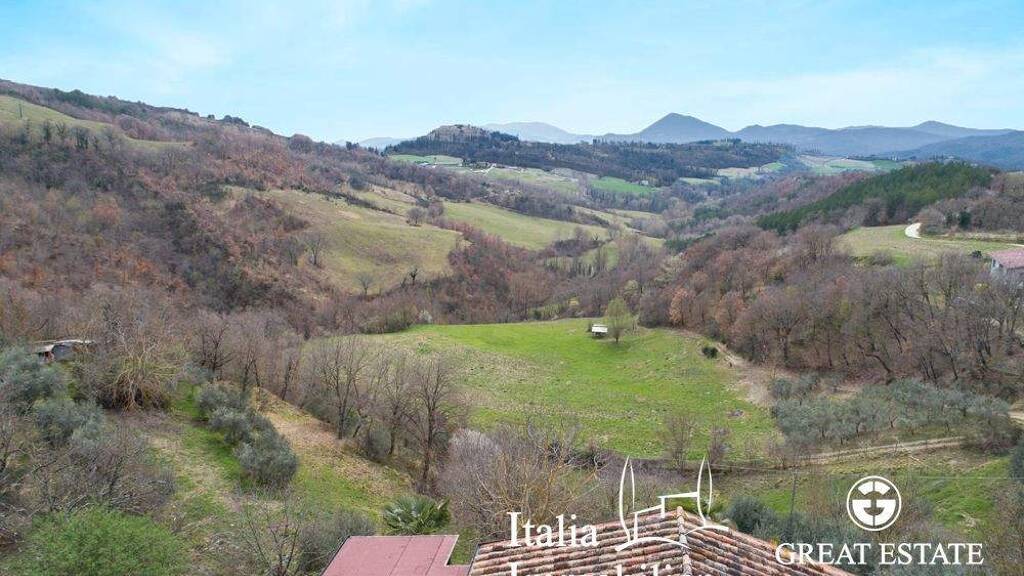 Über eine etwa einen Kilometer lange, landschaftlich wunderschöne Straße gelangt man zu diesem hübschen Bauernhaus aus dem 16. Jahrhundert, das sich in ruhiger, herrlicher Panoramalage inmitten der grünen umbrischen Hügellandschaft befindet und die mittelalterliche Stadt Montone überblickt. Der Zugang zum Anwesen erfolgt durch ein schmiedeeisernes Tor, das sich zum Haupthaus mit einer Fläche von ca. 222 Quadratmetern und einem Nebengebäude mit einer Fläche von ca. 106 Quadratmetern öffnet. Das Haupthaus erstreckt sich über 2 Etagen: Im Erdgeschoss befinden sich ein großes Wohnzimmer mit offenem Kamin, eine geräumige, gemauerte Küche, die typisch für die umbrische Tradition ist, ein Essbereich, ein Badezimmer mit Whirlpool und ein Abstellraum. Im ersten Stock ist der Schlafbereich untergebracht, in dem sich ein Hauptschlafzimmer mit einer großen eigenen Terrasse von 32 Quadratmetern, ein eigenes Bad mit Badewanne, zwei Schlafzimmer (von denen eines derzeit als Arbeitszimmer genutzt wird) und ein Bad mit Dusche befinden. Im Außenbereich ist das Anwesen von ca. 1,6 ha Land umgeben, wovon 1.074 qm als Garten genutzt werden, während das restliche Land als Weide und Olivenhain dient. Zur Verschönerung des Anwesens gibt es einen 4x8 m Swimmingpool und bunte Zierpflanzen.