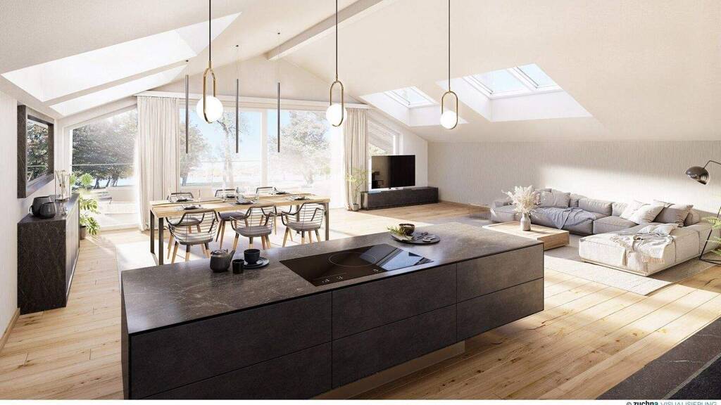In zentraler Lage und in erster Reihe am See besticht dieses Penthouse mit bis zu fünf Zimmer mit offenen, lichtdurchfluteten Räumen und raffinierten Blickachsen. Je nach Ausführung besteht die Möglichkeit das gesamte Dachgeschoß (Top 7 und Top 8) als exklusives Penthouse oder geteilt in eine Wohn- und Büroeinheit bzw. mit einer Einliegerwohnung zu gestalten. Die Top 7 bietet großzügige Wohn- und Schlafzimmer mit Wellnessbereich, Gästedusche uvm. Im Dachgeschoß sind insgesamt fünf Terrassen sowie ein privater Liftzugang vorgesehen. Die Wohnung mit bodentiefen Fensterfronten und Terrassentüren bietet ein Wohlfühl-Erlebnis sowohl im Inneren als auch im Freien. Die Wohnung ist hochwertig ausgestattet. Echtholzparkett verleiht den Räumen zeitlose Eleganz und unvergleichliche Wärme. Große Fensterfronten mit Holz-Alu-Dreifachverglasung versprechen nicht nur beeindruckende Ausblicke, sondern auch optimale Energieeffizienz. Für ein perfektes Raumklima sorgt eine Pellets-Heizung sowie eine Klimatisierung.