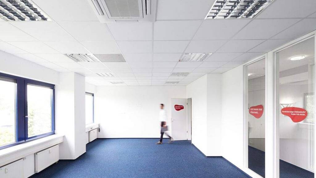 Abgehängte Decken mit integrierter Beleuchtung, Böden in Nadelfilz und hellen Fliesen, ein außenliegender Sonnenschutz & eine Klimatisierung über Splittgeräte runden die Ausstattung ab.