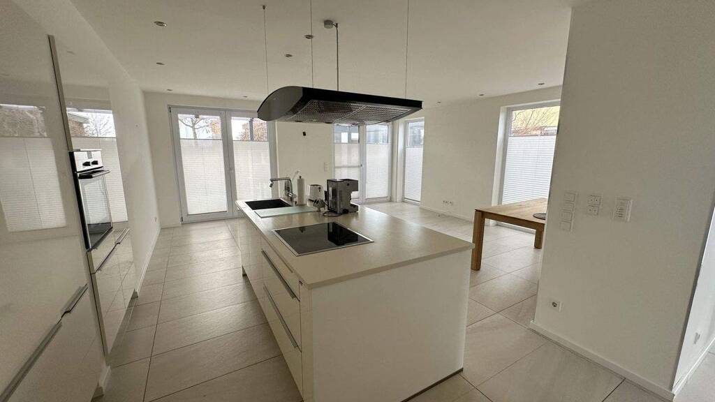 Die ca. 146 m² verteilen sich wie folgt. Im Erdgeschoss wartet ein wunderschöner, offener Wohnraum mit Blick ins Grüne auf Sie: Der großzügige Wohn- und Essbereich mit offener Einbauküche und Kochinsel hat direkten Zugang auf die überdachte Süd-West-Terrasse mit hochwertiger Pergola. Ein Abstellraum sowie ein Gäste WC befindet sich ebenfalls im Erdgeschoss.
