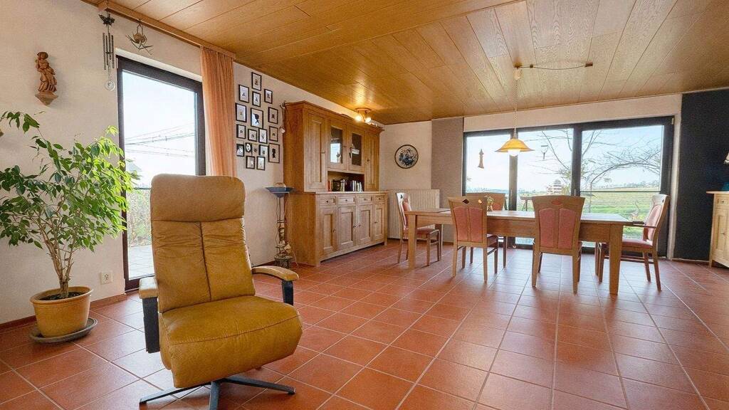 Bereits beim Betreten der Immobilie überzeugt die klare, offene Struktur. Herzstück des Hauses ist der lichtdurchflutete Wohn- und Essbereich, der durch einen klassischen Kamin eine besonders behagliche Atmosphäre erhält. Die angrenzende große Einbauküche ist bereits im Angebot enthalten und ermöglicht Ihnen einen reibungslosen Übergang in Ihr neues Heim. Ein besonderes Highlight für Genießer ist der direkte Zugang vom Essbereich auf die großzügige Sonnenterrasse: Von hier aus schweift Ihr Blick unverbaubar in die Ferne - ein privates Naturkino, das zu jeder Jahreszeit begeistert.