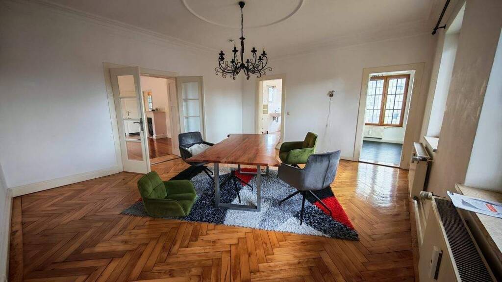 Dem Stil entsprechend befinden sich in der Wohnung massive Parkett- und Dielenböden; die Decken sind mit Stuck eingefasst.