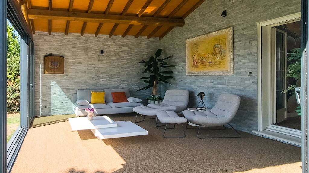 The living space immediately seduces with its beautiful volumes and its unobstructed view of the surrounding hills, all this without being overlooked and sheltered from view. The villa has two bedrooms on the ground floor and an office.