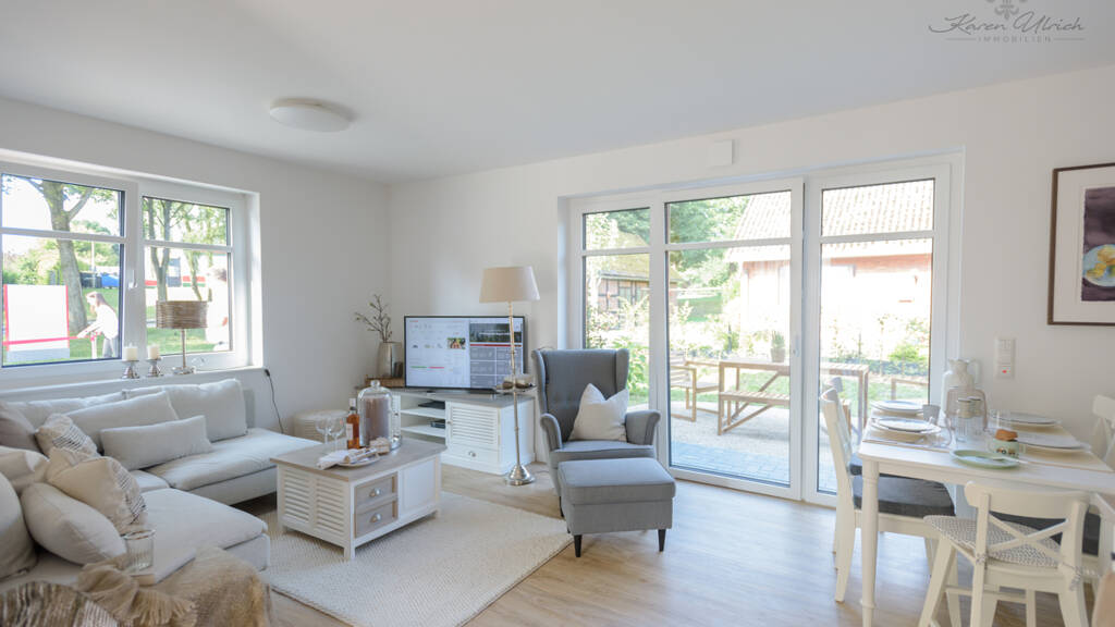 Vom einladenden Flur aus gelangen Sie in eines der hellen Zimmer, das sich flexibel als Schlaf- oder Arbeitszimmer eignet und in das moderne Bad mit ebenerdiger Dusche sowie den großzügigen Wohn-Essbereich mit einer hochwertigen, voll ausgestatteten offenen Küche (in L-Form). Durch den lichtdurchfluteten Wohnbereich mit den bodentiefen Fenstern gelangen Sie auf die sonnige Terrasse mit Südausrichtung. Ein Abstellraum befindet sich unter der weißen Holztreppe, die ins Obergeschoss führt. Hier befinden sich ein weiteres Bad mit ebenerdiger Dusche, das Elternschlafzimmer und ein weiteres, großzügiges Kinder/Schlafzimmer. Ein Hauswirtschaftsraum ist in allen Wohneinheiten integriert. Ihnen steht auf dem Spitzboden weitere Abstellfläche zur Verfügung. Das ganze Objekt ist in den Wohnräumen mit Designboden in Eichenoptik ausgestattet, verfügt über eine Fußbodenheizung und hochwertigste Ausstattung in allen Wohnbereichen. Das barrierearme Wohnkonzept ermöglicht das Wohnen für alle Generationen. Jede Wohneinheit verfügt über einen eigenen Stellplatz. Die ansprechend gestaltete Gartenanlage steht den Mietern zur Verfügung und die Rasenfläche wird durch diese gepflegt.