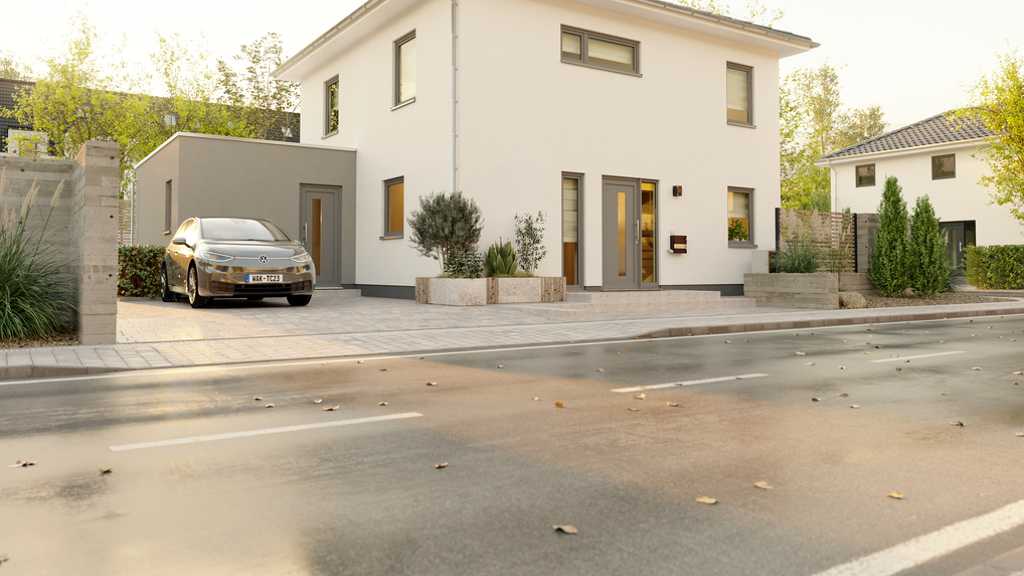Die kubische Form ist der Klassiker im Stadthausdesign und prägt auch das Aussehen unseres Stadthaus Flair 124. Im Inneren setzt sich der urbane Stil fort: der großzügige Wohn- und Essbereich erstreckt sich über die gesamte Hausbreite und ist das Herzstück des Hauses. Große Fenster lassen viel Tageslicht hinein und führen gleich hinaus zu Ihrem Wohnzimmer im Grünen – der Terrasse. In der Küche haben Sie viel Platz für gemeinsame Kochabende und das Familienfrühstück unter der Woche. Auch das Obergeschoss zeigt sich im klaren Baustil des Flair 124. Hier befinden sich drei Räume, die Sie als Schlaf-, Kinder-, Gäste- oder Arbeitszimmer nutzen können. Dank großer Fenster wirken alle Zimmer hell und freundlich. Schlicht, schick, mit vielen Details und klarer Linie – im Stadthaus Flair 124 werden Sie sich wohlfühlen.