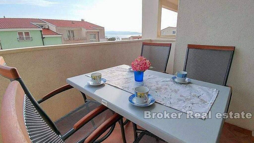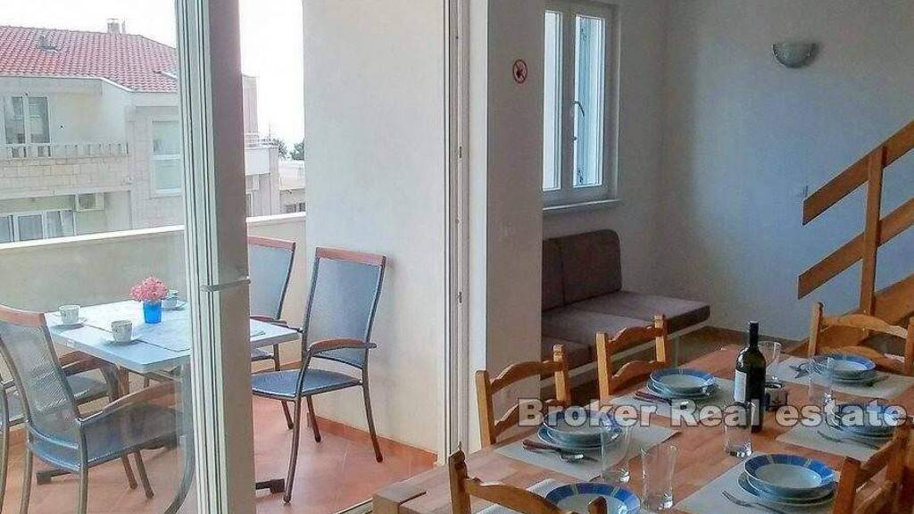 Zum Verkauf steht eine möblierte Wohnung auf zwei Etagen, in der Stadt Makarska. Die Wohnung befindet sich im zweiten und dritten Stock einer Stadtvilla mit insgesamt acht Wohnungen, mit eigenem Außenstellplatz und einem Stellplatz in der Garage. Die Wohnung verfügt über drei Schlafzimmer, einen separaten Eingang, Balkone und Badezimmer auf beiden Etagen und ein offenes Wohnzimmer mit Küche und Essbereich.