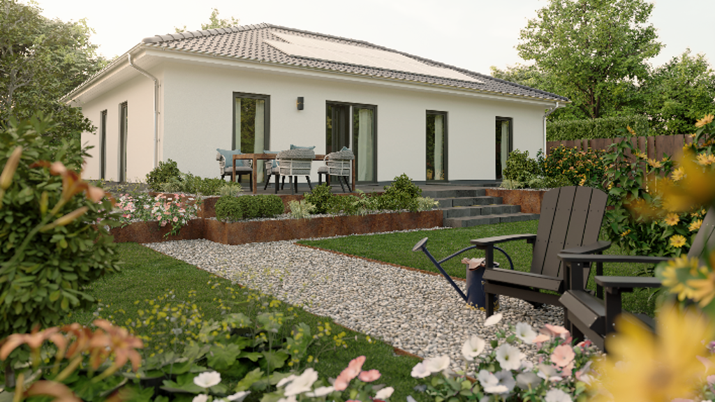 Er bietet ein gemütliches Wohnzimmer mit Essbereich, ein geräumiges Schlafzimmer und zwei weitere Zimmer. Alle Räume sind dank großer Fenster hell und freundlich. Mit quasi einem Schritt sind Sie mit Ihren Liebsten im Garten und können die Sommerzeit bei einem Grillabend genießen. Das schöne Walmdach gibt dem Bungalow seinen Charakter. Der Bungalow 110 ist ein perfekter Ort für Menschen, die die gegenseitige Nähe lieben und zugleich ihren individuellen Platz schätzen.