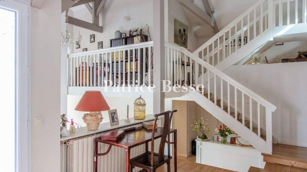 As for the other rooms, meticulously laid out, they all stand out thanks to their oak hardwood floors and light-colour walls, whereas, on the other side, a staircase leads to a spacious mezzanine, currently used as a TV and reading room, which provides an additional cosy and inviting space for this level.