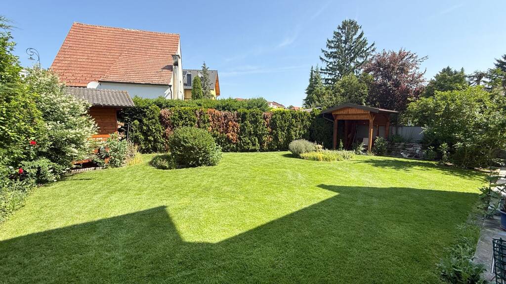 Der Garten lädt mit überdachtem Sitzplatz und Hollywoodschaukel zum Verweilen ein. Gerätehaus und Garage bieten ausreichend Platz für Gartengeräte und Stauraum.