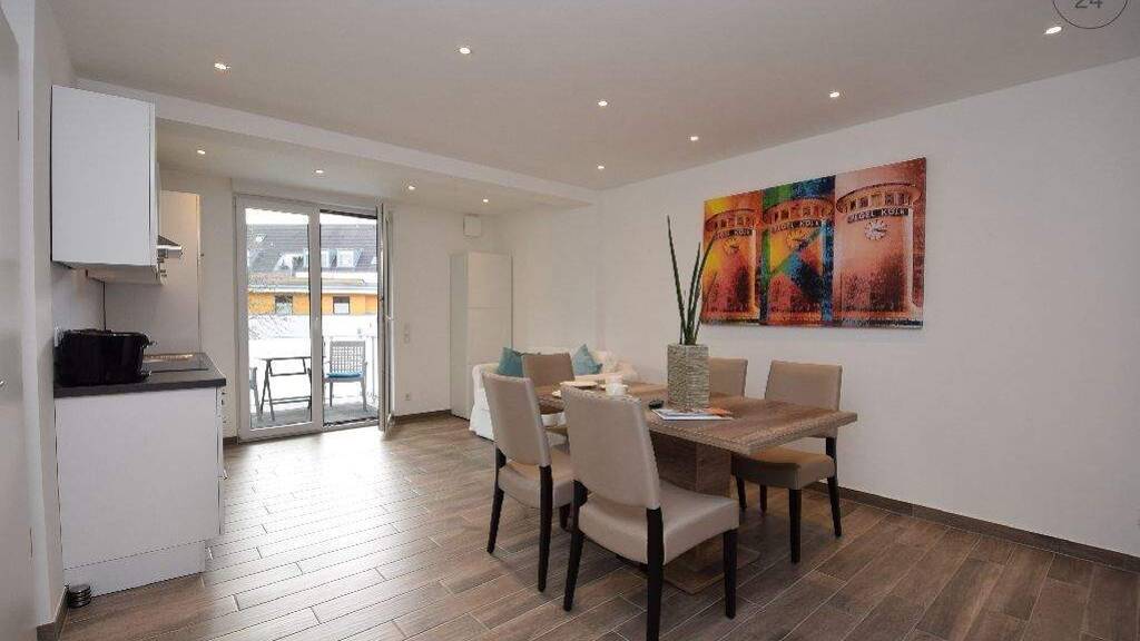 Diese 2-Zimmer Wohnung in der 2. Etage eines 2015 sanierten 4-Parteienhauses präsentiert sich mit einem schönen Grundriss, hochwertigen Materialien und einem schönen Balkon zum ruhigen Innenhof. Schon von der Eingangstür fällt der Blick durch die bodentiefen Fenster auf den Balkon zum ruhigen Hinterhof mit 2 Stühlen und Tisch. Moderne Möbel mit klaren Linien, ein hochwertiger Fliesenboden in Holzoptik mit Fußbodenheizung, 2 große Wandflatscreens mit Sat-TV, WLAN und eine kontrollierte Wohnraumlüftung sorgen für ein sehr angenehmes und leichtes Wohngefühl. Die helle Küchenzeile verfügt über eine kleine Spülmaschine, ein Cerankochfeld mit Dunstabzugshaube und Backofen, Toaster, Kaffeemaschine u.v.m.. Ein großer Essbereich für 5 Personen ist vorhanden, eine zusätzliche Schlafcouch mit Lattenrost ist optimal für den Besuch geeignet. Auch das kombinierte Wohn-Schlafzimmer zeigt sich großzügig, bodentiefe Fenster sorgen für Licht und Leichtigkeit. Es verfügt über ein Boxspringbett (1,80m x 2,00 m) und einen 2-teiligen Kleiderschrank. Der LED-Flatscreen kann geschwenkt werden, damit man besten Blick vom Bett sowie vom Relaxsessel hat (wird noch bereitgestellt). Edel zeigt sich auch das Bad mit bodengleicher Dusche mit Duschrinne und Überkopfbrause. Weitere Merkmale: Nichtraucherwohnung, WLAN, kontrollierte Wohnraumlüftung, Schließanlagensystem, Wasseraufbereitungssystem, Waschmaschine und Trockner zur Mitbenutzung im Keller. Stellplatz bei Verfügbarkeit anmietbar, E-Lademöglichkeit fußläufig erreichbar