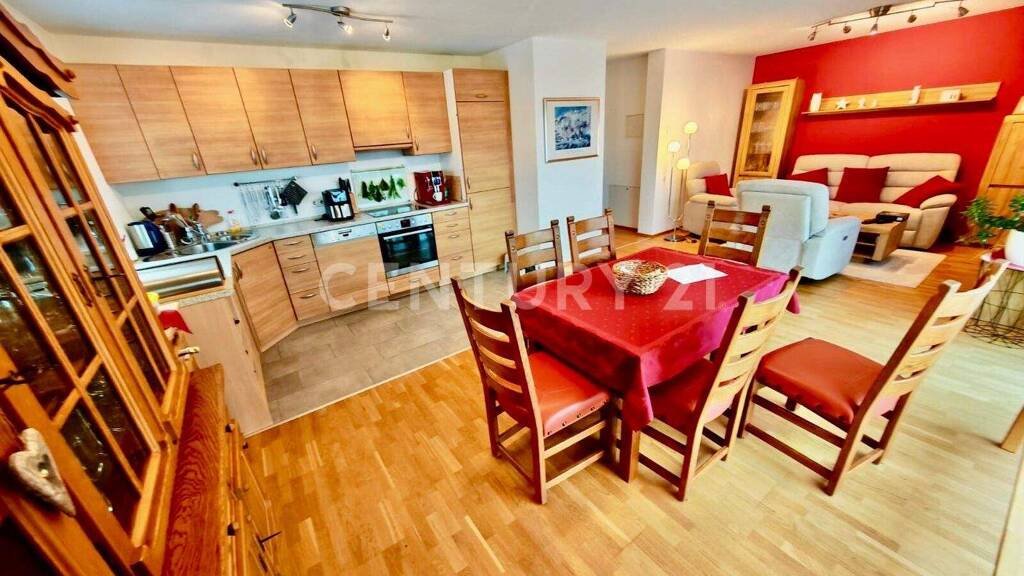 Das Herzstück der Wohnung bildet der offene Wohn- und Essbereich mit wunderbarem Blick ins Grüne. Von hier aus genießen Sie absolute Ruhe und eine entspannte Atmosphäre.