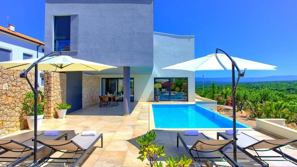 Bei der Agentur Stan Grad Immobilien wird ein wunderschönes Haus zum Verkauf angeboten, das perfekt für den Urlaub in der Region Insel Krk geeignet ist. Dieses begehrte moderne Haus befindet sich an einem sehr guten, ruhigen Standort in einer Sackgasse, in der Nähe des bekannten touristischen Ziels der Stadt Krk. Das Haus, das von hoher Bauqualität ist, besteht aus drei Etagen. Es ist mit hochwertigen Möbeln und Materialien eingerichtet und dekoriert.