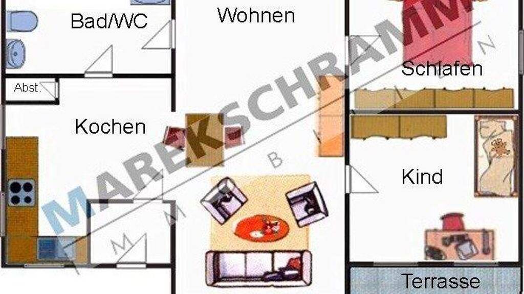 Die Wohnung überzeugt durch eine funktionale und zugleich großzügige Raumaufteilung. Vom Flur aus erschließen sich das große Wohn- und Esszimmer, die Küche mit angrenzender Speisekammer beziehungsweise Abstellraum, das Schlafzimmer sowie ein Kinderzimmer. Das Badezimmer ist mit Dusche und WC ausgestattet. Besonders hervorzuheben ist die großzügige Terrasse, die zusätzlichen Wohnkomfort bietet und den Wohnbereich ins Freie erweitert.