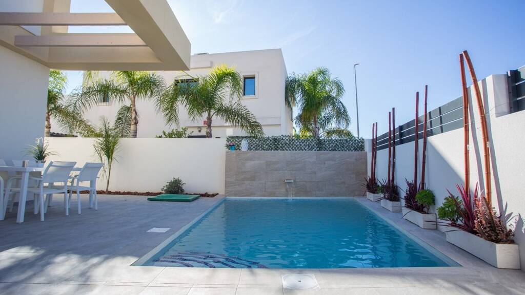 Das Innere der Villa besteht aus einem geräumigen offenen Wohn- und Essbereich mit Terrassentüren, die Zugang zur Terrasse und zum Garten bieten, einer modernen Küche im amerikanischen Stil, einem separaten Gäste-WC und einer Waschküche. Im Erdgeschoss befindet sich auch die Master-Suite mit einem großen Schlafzimmer, einem eigenen Bad und einem Ankleidebereich. Die Innentreppe führt Sie in den ersten Stock mit zwei weiteren Doppelschlafzimmern, einem Gästebad und einer 22 m2 großen Sonnenterrasse mit Blick auf den Gartenbereich. Optional gibt es eine große Dachterrasse, die entweder über eine Wendeltreppe oder eine feste Treppe zu erreichen ist, sowie einen privaten Swimmingpool von 5 x 3 m.