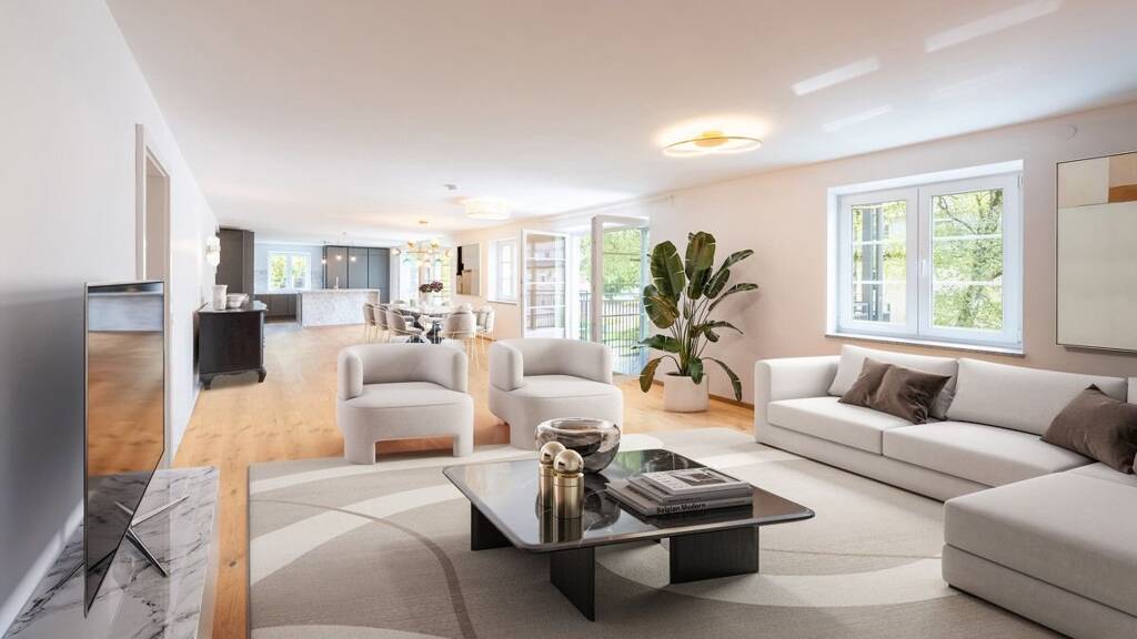 Der durchdachte Grundriss sorgt für modernen Wohnkomfort und ist ideal für Familien geeignet. Das Herzstück der Maisonette bildet das geräumige Wohnzimmer im Loftstil, verbunden mit einer maßgefertigten Küche, die über eine Kochinsel und moderne Geräte verfügt. Von hier aus gelangen Sie auf die großzügige, vollständig überdachte Sonnenterrasse, die einen herrlichen Ausblick bietet.