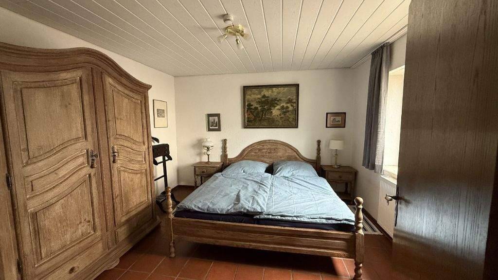 Das Obergeschoss beherbergt die privaten Rückzugsorte: 1 Schlafzimmer, mit eigenem Kleiderschrank und dekorativen Elementen, die für eine ruhige und entspannende Atmosphäre sorgen. Das Wohnzimmer lädt zu gemütlichen Stunden ein. Das Bad mit Badewanne und Dusche und Fenster.