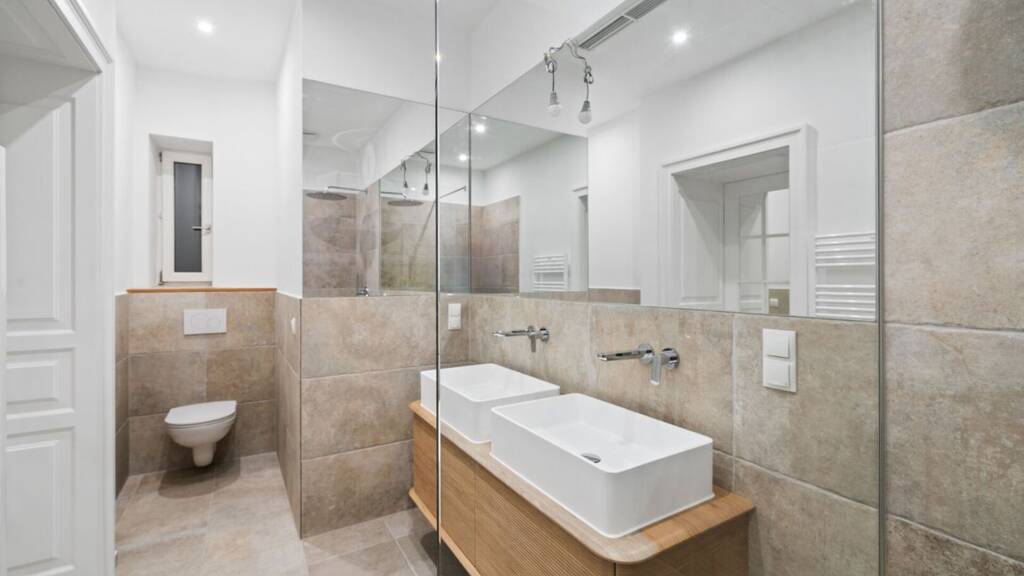 Der Mittelpunkt der Wohnung ist die weitläufige Wohnküche mit hochwertiger Tischlerküche, Kochinsel und Stein-Arbeitsfläche - ein Raum, der sowohl repräsentativ als auch alltagstauglich ist. Zwei Schlafzimmer verfügen jeweils über ein Bad en suite, ergänzt durch ein separates Gäste-WC. Ein großzügiger Abstell- bzw. Technikraum sorgt für Ordnung und Funktionalität.
