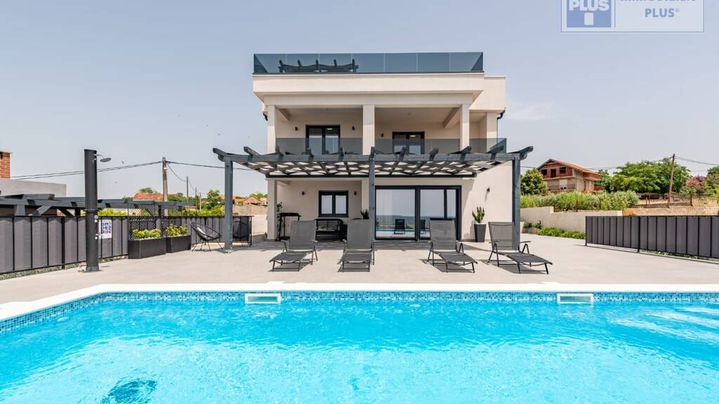 Bei diesem Angebot handelt es sich um eine luxuriöse Villa mit Swimming Pool und Meerblick, mit moderner Einrichtung in dem ruhigen Örtchen Benkovac und bietet auf ca. 370 m² über einen großzügigen,klimatisierten Wohnbereich. Das Anwesen ist mehr als nur ein Ort zum Leben -es ist eine Oase der Ruhe, fernab vom hektischen Treiben der Stadt.