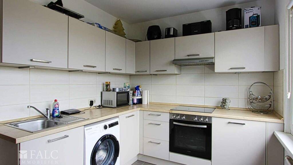 Die separate Küche überzeugt mit einer neuwertigen, hellen Einbauküche, die bereits im Kaufpreis enthalten ist. Auch der Anschluss für die Waschmaschine befindet sich hier - für maximalen Komfort im Alltag.