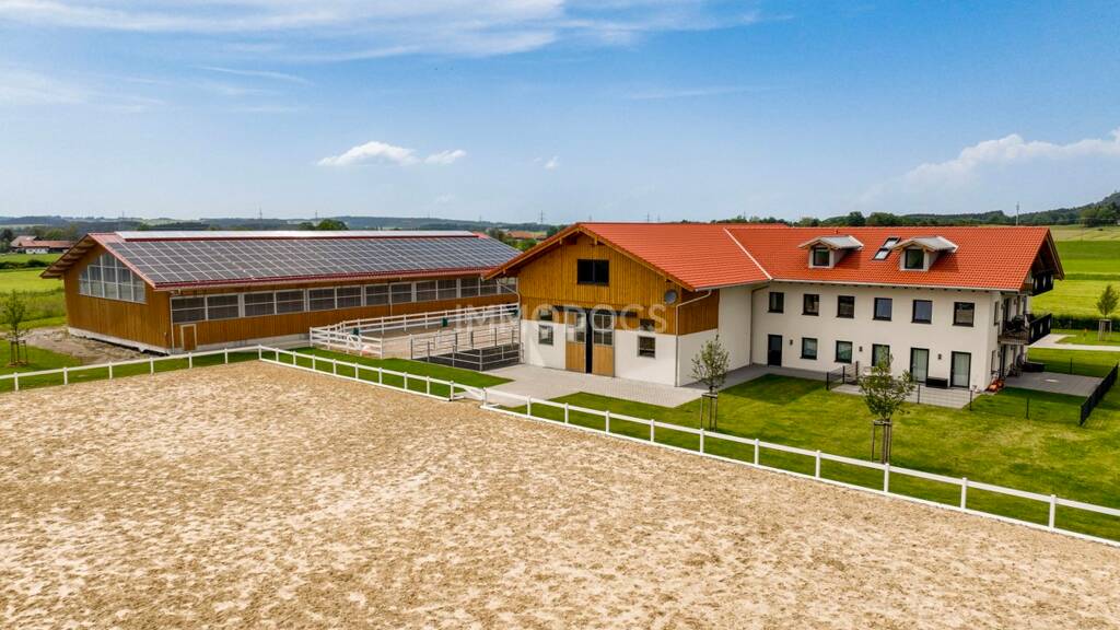 Die Liegenschaft befindet sich im Landkreis Oberallgäu mit sensationellem Blick auf die Allgäuer Alpen. Die exklusive und hochwertig ausgestattete Reitanlage bietet eine besondere Kombination aus einer modernen Reitsportimmobilie mit optimalen Wohnmöglichkeiten vor Ort. Die Anlage gliedert sich in einen Stallkomplex mit insgesamt sechs Paddock-Boxen, eine Reithalle mit rund 800 m², einen großzügigen Außenreitplatz sowie ein Wintersandplatz. Ausreichend Auslauf erhalten die Vierbeiner auf der rund drei Hektar großen Koppel-Fläche. In den Stallungen ist sowohl eine Wasch-Box, ein Heulager als auch eine Sattelkammer vorhanden.