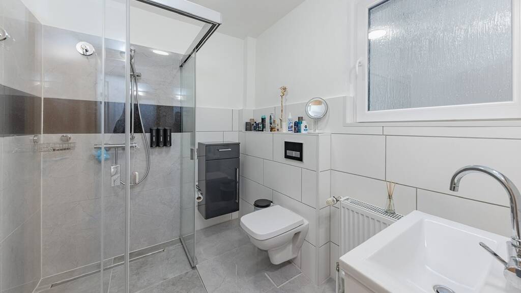 Der Topographie geschuldet ist die kleine Zweizimmerwohnung im I. Untergeschoß ebenfalls noch mit einem Balkon mit ebendiesem Blick ausgestattet. Auch diese Wohnung wurde komplett saniert und ebenfalls hochwertig ausgestattet. Inklusive neuem Duschbad mit großer Dusche, Waschtisch, WC und Fenster.