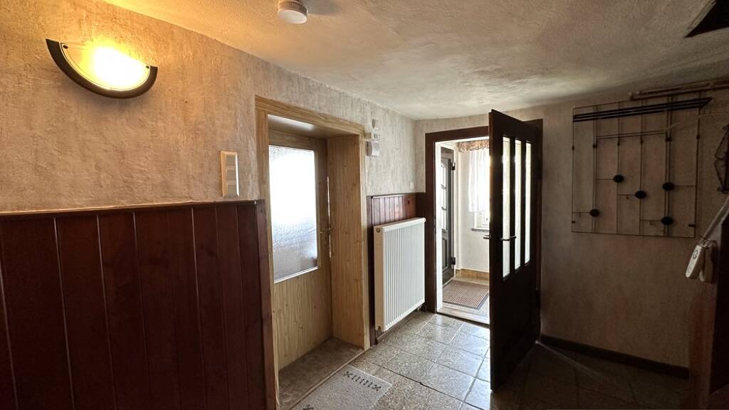 Über eine Holztreppe erreichen Sie das Obergeschoss, wo sich zwei Schlafzimmer befinden. Zusätzlich gibt es hier den Zugang zum Dachboden, der weiteren Stauraum bietet. Die Kellerräume des Hauses sind von außen zugänglich und bieten ausreichende Lagermöglichkeiten.