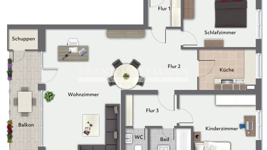 Sie betreten die Wohnung und befindet sich in einem in sich geschlossenen, praktischen Windfang/Flur. Vom Flur treten Sie in den Wohn-/ und Essbereich. Von dem großzügigen Wohn-/ und Essbereich ist der geräumige Balkon zu erreichen. Auf dem Balkon befindet sich ein kleiner Abstellraum, welcher zusätzliche Staufläche bietet. Gegenüberliegend vom Wohnbereich finden Sie die Küche, welche mit einer funktionalen Einbauküche und einem Fenster ausgestattet ist. Das Schlafzimmer liegt ebenfalls im vorderen Bereich der Wohnung. Über einen weiteren Flur ist das Kinderzimmer zu erreichen sowie das Wannenbad und das separate WC.