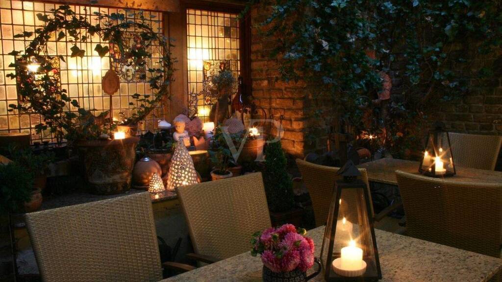 Beim Betreten des Hauses über den ursprünglichen Gastronomieeingang entfaltet sich sofort die besondere Atmosphäre des Ensembles. Der großzügige Gastraum mit gemütlichen Sitzecken und einladender Bar versprüht authentisches Wirtshausflair. Eine angrenzende Diele mit kleiner Sitzecke bietet eine ruhige Rückzugsmöglichkeit, während im hinteren Bereich ein weiterer offener Speisebereich für zusätzliche Tische anschließt. Direkt dahinter lädt ein charmant gestalteter Innenhof zu lauen Sommerabenden, gemütlichen Stunden bei einem Glas Wein oder einem entspannten Essen im Freien ein. Ein integrierter Essenslift verbindet den Gastraum mit der Küche und sorgt für effiziente Abläufe.